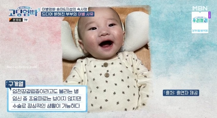 그런데 알고 보니 이혼 준비 중이 아니라 남편의 군입대로 잠시 이별을 준비하고 있는 거라고 하네요. 엎친 데 덮친 격으로 막내아들이 구개열 병을 앓고 있대요. 구개열이란 입천장갈림증이라고도 불리는 병으로, 임신 중 초음파로 보이지 않지만 수술로 정상적인 생활이 가능하다고 하네요.