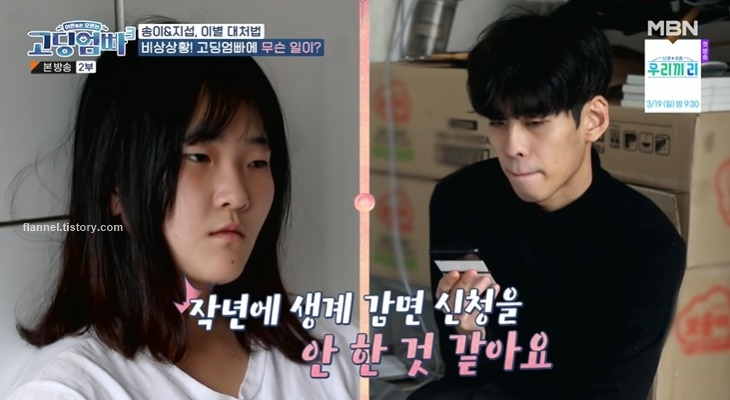 이지섭은 현재 군대 서류를 준비 중이래요. 생계유지 곤란 사유 병역 감면을 받기 위한 것. 1차 서류는 제출한 상태고 2차 서류 준비로 입대 1년을 연기 신청한 상황이라고 하네요. 하지만 송이는 입대까지 단 5개월이 남은 상황이라 불안한 상태래요. 하지만 남편은 군 면제를 확신하네요.