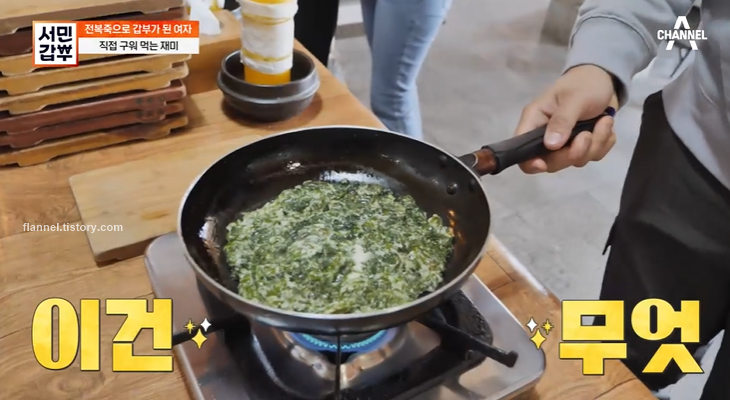 그리고 당일 손질한 약 3천 마리의 전복 내장을 갈아 사용한대요. 내장이 많이 들어가야 진하고 고소한 맛이 나온다고 하네요. 쌀, 전복 내장, 참기름을 넣고 일정한 120도 온도에서 볶아줘요. 쌀을 미리 볶아둬야 손님들이 오면 물만 붓고 끓여서 바로 나갈 수 있대요.