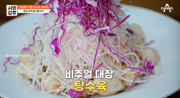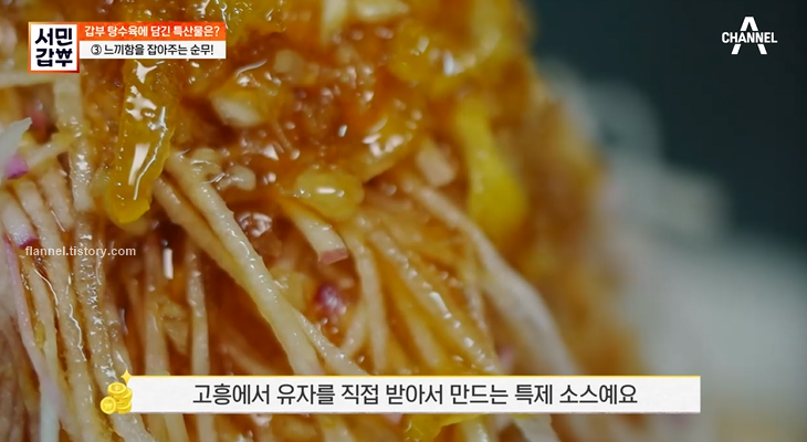 탕수육에 올라가는 순무는, 순무가 하도 많아서 채를 썰어 올려 봤는데 손님들 반응이 너무 좋았대요. 여기에 직접 개발한 유자 소스로 상큼함을 더했어요. 알싸한 순무 향까지 잡아준다네요.