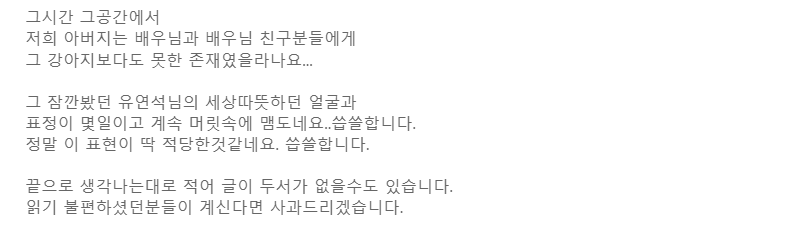 예능같은 프로그램에서 온갖 개념배우 배려심넘치는 좋은인성을 가진 배우로 나오는 유연석님을 저는 차마 보기가 거북하고 너무나도 속이 상하는데 어디 하소연할곳도 없고하여 씁쓸한마음