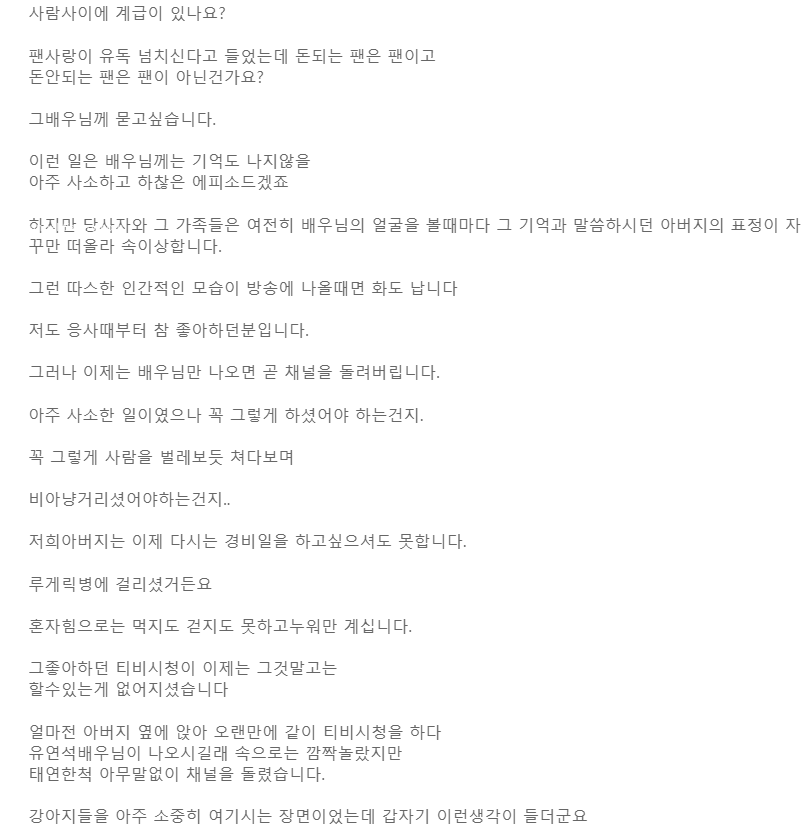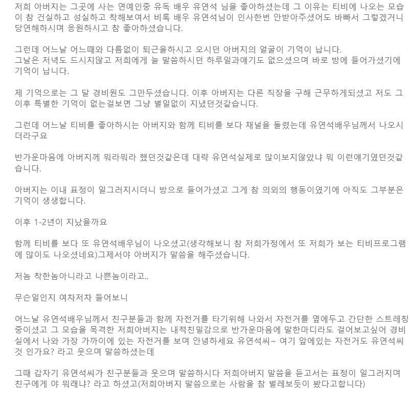 물론 작성자는 6, 7년 전 일이고 아버지에게 전해 들은 이야기라며 믿고 안 믿고는 본인 자유라고 했어요. 하지만 가족들은 유연석이 TV에 나올 때마다 속상한 마음을 감출길 없다며 하소연했어요. 또한 아버지가 현재 루게릭 병으로 투병 중이라는 말도 덧붙였네요.