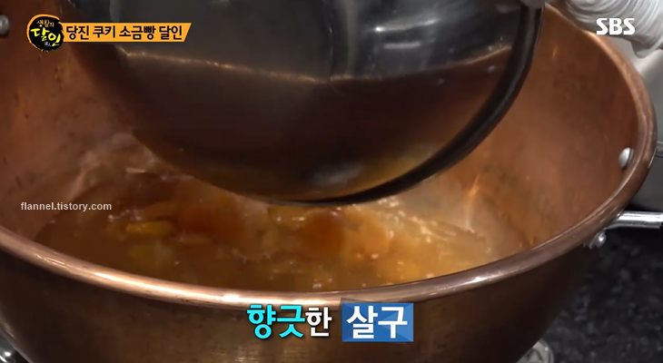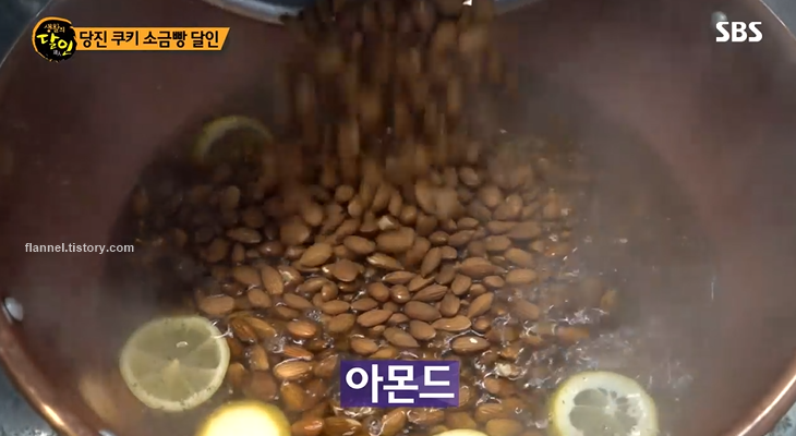 반죽 못지 않게 맛의 핵심이 되는 건 바로 쿠키예요. 비법 재료로 몰트 진액, 보리 100%가 들어간다고 하네요. 일본 전통 차인 호지차와 향긋한 살구가 만나는 것도 특이하네요. 중불에서 오랜 시간 끓여주다 레몬, 아몬드를 추가. 쿠키 만드는데 손이 정말 많이 가네요.