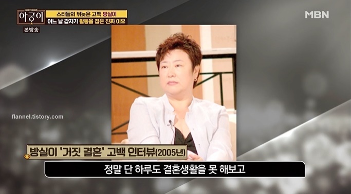 한편 방실이는 지난 2005년 거짓 결혼 고백 인터뷰를 전해 충격을 안기기도 했어요. 당시 방실이는 단 하루도 결혼 생활을 못 해보고 12년간 결혼한 여자로 살아왔다며, 전 소속사 사장님과의 비즈니스 때문에 온 얼굴도 모르는 사람과 결혼보도가 났다고 밝혔어요.