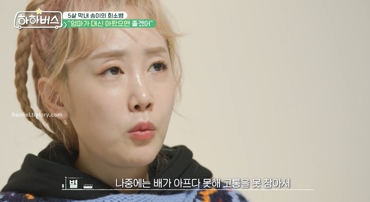 송이는 건강하고 씩씩한 아이였지만 어느 날 갑자기 배가 아프다는 신호를 보냈대요. 별은 장염인가 싶었지만 열이 없어 의아했대요. 그런데 나중에는 배가 아프다 못해 고통을 못 참아서 데굴데굴 구르는 수준까지 왔다고 하네요.