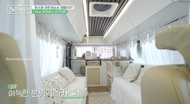 버스 내부가 싹 바뀌었네요. 버스 절반은 아늑한 분위기의 카페로 변신했어요. 미니 냉장고는 물론 싱크 볼, 쿠커, 커피머신도 준비됐네요.