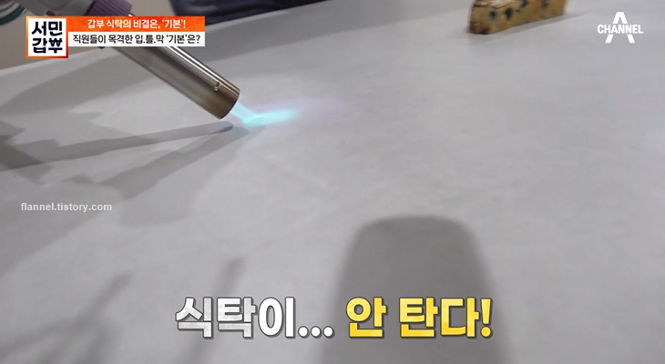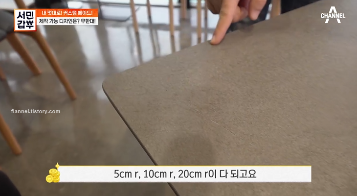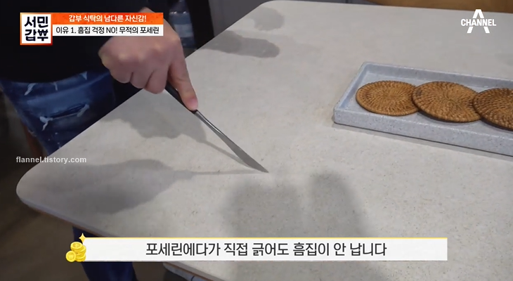 갑부는 최근 뜨고 있는 포세린을 이용해 식탁을 만들고 있어요. 세라믹 중 최고급 자재라고 하네요. 칼로 긁어도 흠집이 전혀 안 나더라고요. 불로도 안 타고 김치국물 자국도 안 남. 진짜 좋긴 하네요.