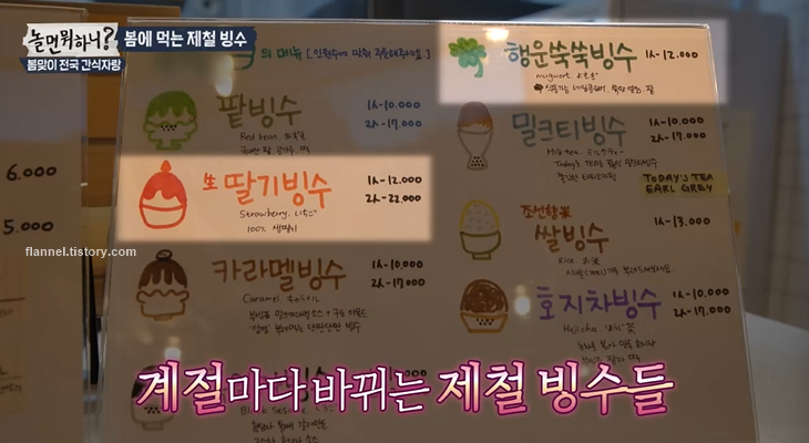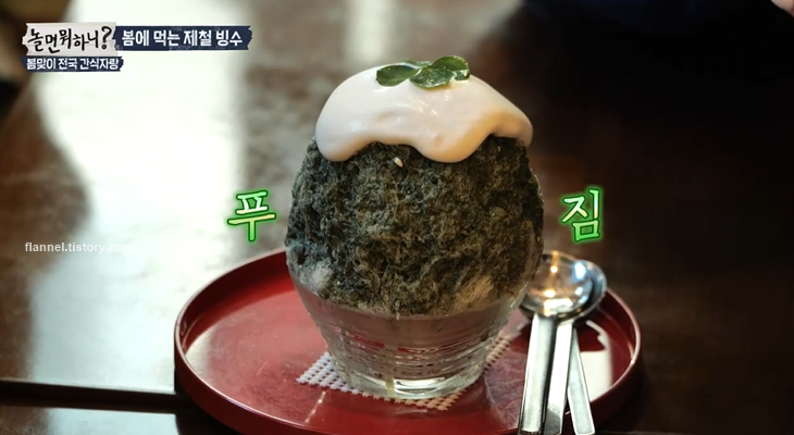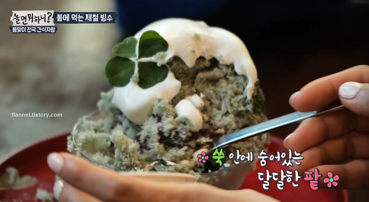 '놀면뭐하니' 멤버들이 빙수 맛집을 찾았어요. 한옥 느낌의 외관에 다양한 제철 빙수를 판매하고 있었는데요. 메뉴는 계절마다 제철에 맞게 바뀐대요. 지금은 딸기빙수, 쑥빙수가 제철이래요. 겨울에는 귤 빙수가, 여름에는 옥수수나 감자빙수가 등장한대요. 이곳은 계절마다 방문해야겠어요.