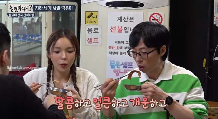 유재석은 주먹밥에 떡볶이를 듬뿍 얹어 먹네요. 저 조합도 예술일 듯.