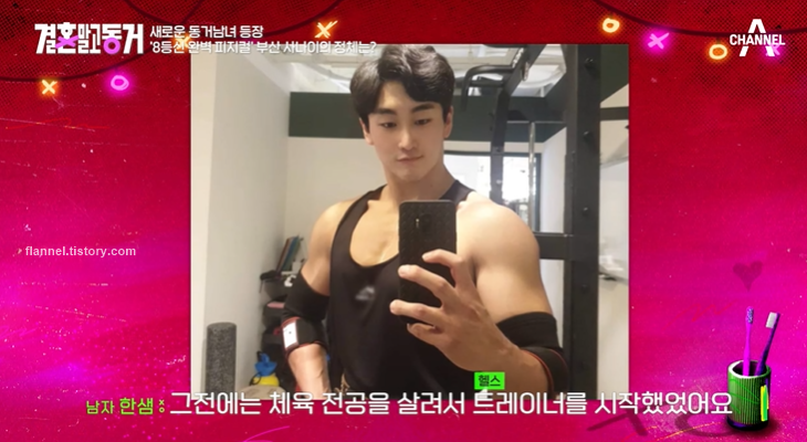 '결혼 말고 동거'에 '피지컬100'에 출연했던 정한샘이 출연했어요. 정한샘 나이는 32세로 직업은 뮤지컬 배우이자 부산에서는 PT숍 대표를 하고 있다고 하네요. 피지컬100에서는 탑20에 들었대요. 그전에는 체육 전공을 살려서 헬스 트레이너로 시작, 이후 피트니스 선수로 활동하다 피티샵까지 오픈하게 됐대요. 총 4곳의 PT숍을 운영하고 있다고 하네요.