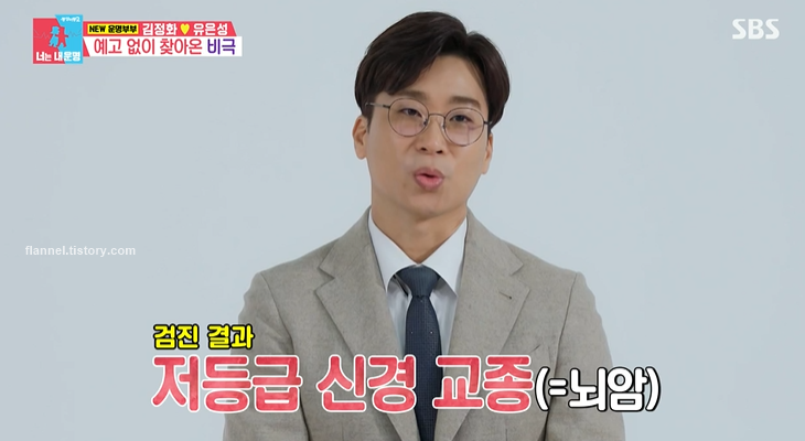 유은성은 갑작스럽게 찾아온 비극에 대해 털어놓기도 했어요. 작년 9월 갑작스럽게 시작된 두통이 일주일 동안 없어지지 않았대요. 그래서 혹시 몰라 종합검사를 했고, 며칠 만에 간호사분이 전화해서 최대한 빨리 내원하라고 했다네요. 검진 결과 병명은 저등급 신경 교종(뇌종양, 뇌암)이었대요. 신경 교종이란 뇌에 있는 신경세포에서 자라는 암을 말해요.