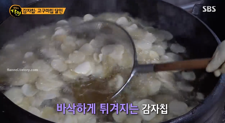 감자에는 고구마보다 수분이 더 많기 때문에 감자끼리 닿지 않고 튀겨내는 게 중요하대요. 패스트푸드 감자와 달리 얇아서 바삭바삭할 것 같아요.