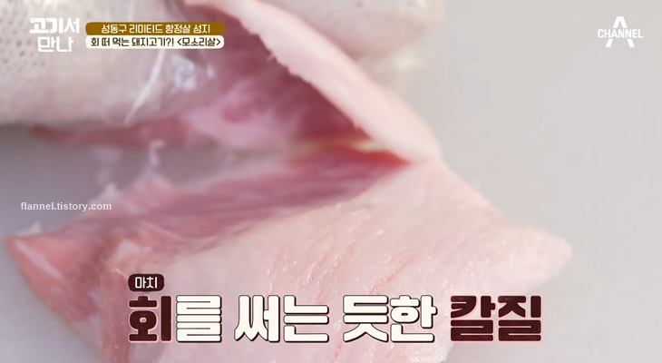 항정살은 포를 떠서 좀 더 먹기 수월하게 한대요. 마무리로 꾹 눌러주는데, 돈가스 만들 때 고기를 두드려서 부드럽게 만드는 거랑 같은 원리래요. 포 뜨는 항정살은 어디서도 본 적 없는 장면이네요.