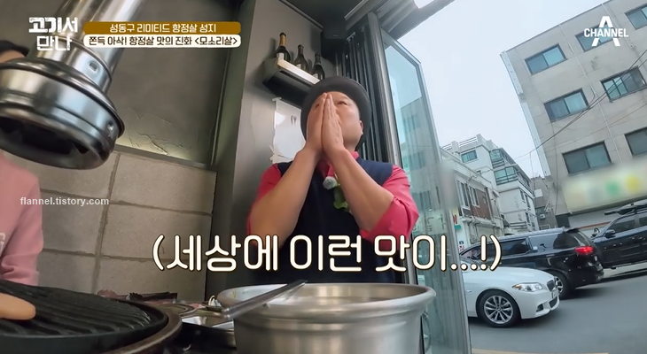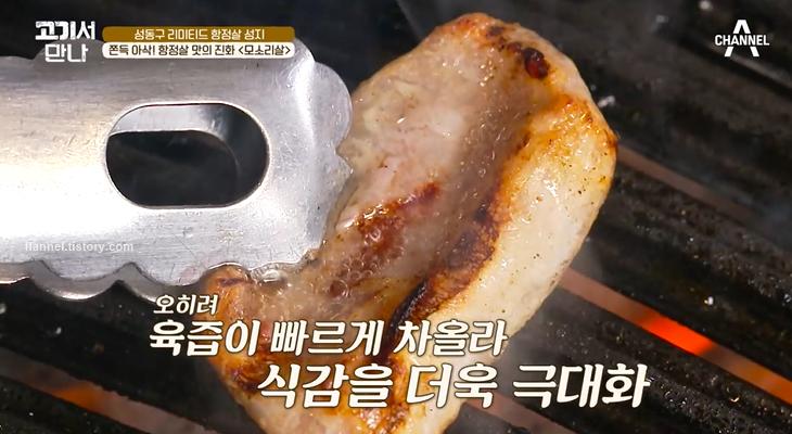 바짝 익히기보다는 80~90% 익었을 때가 가장 맛있대요. 소고기처럼 덜 익었다 싶을 때가 딱이라고. 강호동 찐 리액션 나오네요. 너무 쫄깃하고 모든 결이 입안에서 썰리는 느낌이래요.