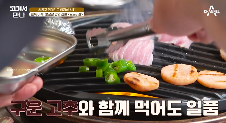 보통은 마늘을 구워 먹는데 여기는 고추를 구워서 고기와 함께 먹는대요. 매운맛은 날아가고 불맛 입힌 알싸한 향이 올라온다고.