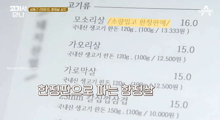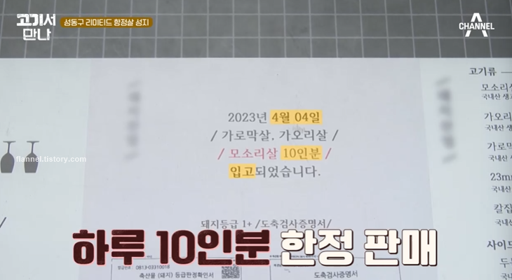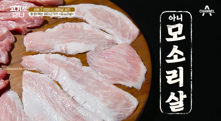 대표 메뉴는 항정살인데 하루 10인분 한정 판매 중이래요. 이 식당에서는 항정살을 모소리살이라고 부르네요. 이유가 뭘까 싶었는데 항정살은 양이 적게 나오는데 모서리도 끝부분, 작은 쪽이니까 모소리살이라고 부른대요.