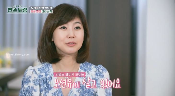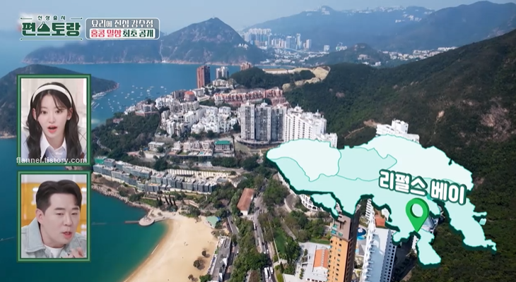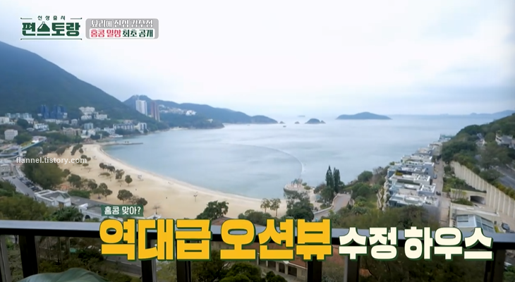 이날 최초로 강수정 집이 공개되기도 했어요. 테라스에서 바라보는 바다 뷰가 예술이더라고요. 리펄스 베이가 보이는 바다 앞 아파트에서 살고 있대요. 리펄스 베이는 성룡, 유덕화 등 유명 연예인들이 거주하는 홍콩의 대표 부촌으로 유명하죠.