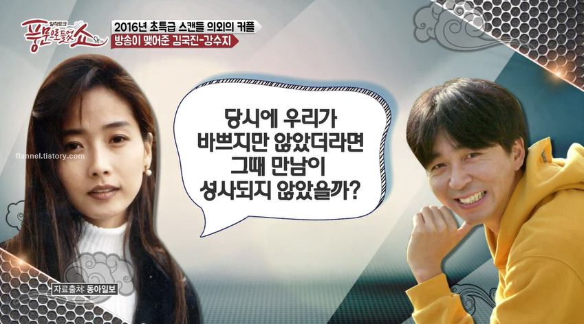 아무튼 이후 김국진, 강수지는 전남편 전부인과 이혼 후 '불타는 청춘'에 함께 고정 출연하게 돼요. 이후 연인 사이로 발전, '치와와 커플'로 불리며 큰 사랑을 받았어요.