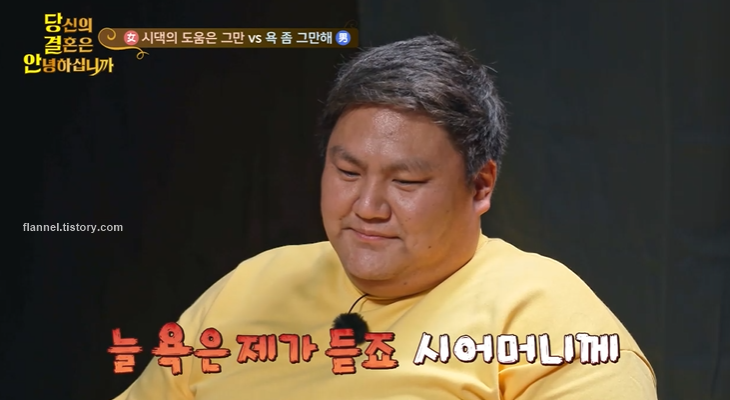 노랑 남편의 불만은 화가 많은 아내 성격이에요. 심하면 욕설까지 한다고 하네요. 이에 아내는 남편도 그런다며 가끔 육탄전으로 싸움이 번진대요.