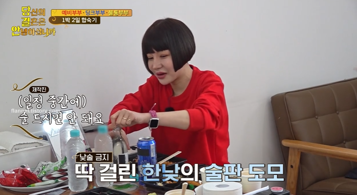 빨강 아내는 숙소에서 점심을 먹는 동안에도 소주잔을 채워 제작진의 지적을 받기도 했어요.