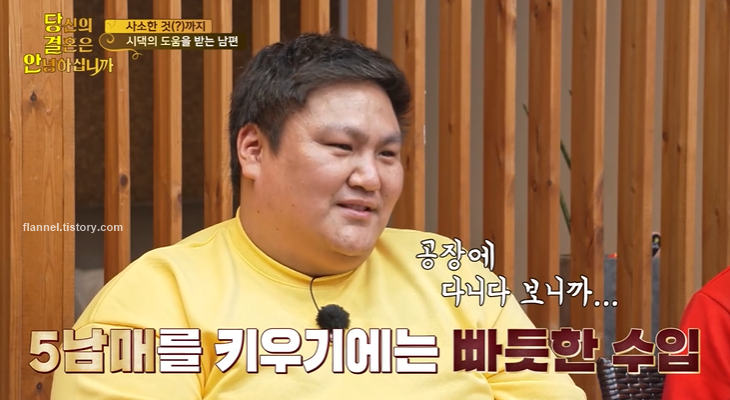노랑 남편 직업은 현재 공장에 다니고 있는데, 5남매를 키우기엔 수입이 빠듯하대요. 아이 한 명이 아프면 돌아가면서 아프니까 치료비가 상당한데, 그래서 시댁을 갈 수밖에 없는 것 같대요.
