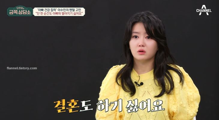 "그래서 솔직히 결혼도 하기 싫어요. 정말 아들이 되어줄 좋은 남자가 나타나서 결혼을 결정한거지.. 남자친구한테도 얘기를 하죠. '미안한데 난 지금 아빠랑 함께하는 시간이 너무 소중해. 네가 뒷전인 것 같아도 어쩔 수가 없다'라고"