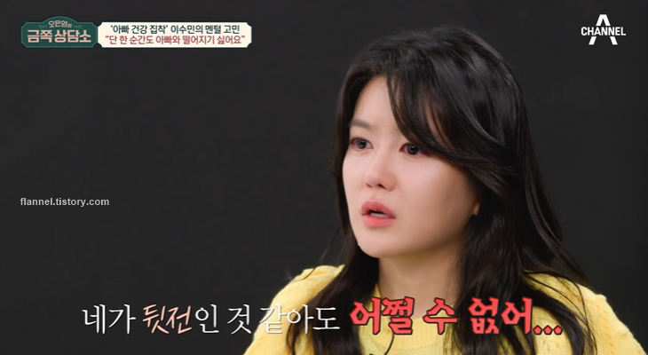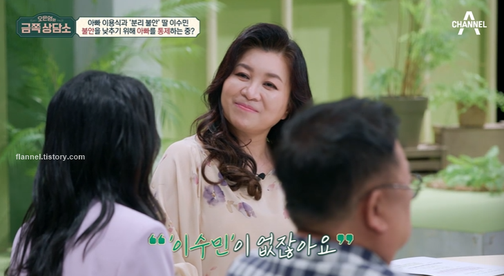 그러자 오은영은 이수민이 분리 불안 증상이 있다고 하네요. 아빠에 대한 유착이 있다고. 이런 불안을 방어하기 위해 통제라는 수단을 쓰고 있대요. 아버지를 통제한다는 것. 이렇게 되면 이수민이 없지 않냐고 꼬집어 말하네요. 아빠와 딸의 역할이 바뀌었고, 아내의 역할까지 다 하고 있대요.