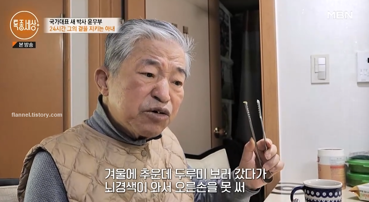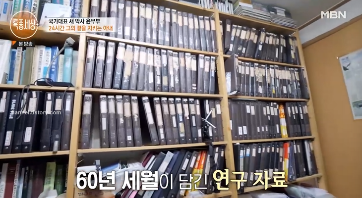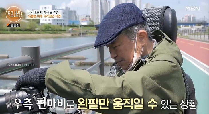 현재 윤무부는 뇌졸중으로 쓰러진 뒤 우측 편마비로 왼팔만 움직일 수 있다고 해요. 그럼에도 왼팔로 새 사진을 찍으며 여전히 새 연구에 몰두하고 있더라고요.
