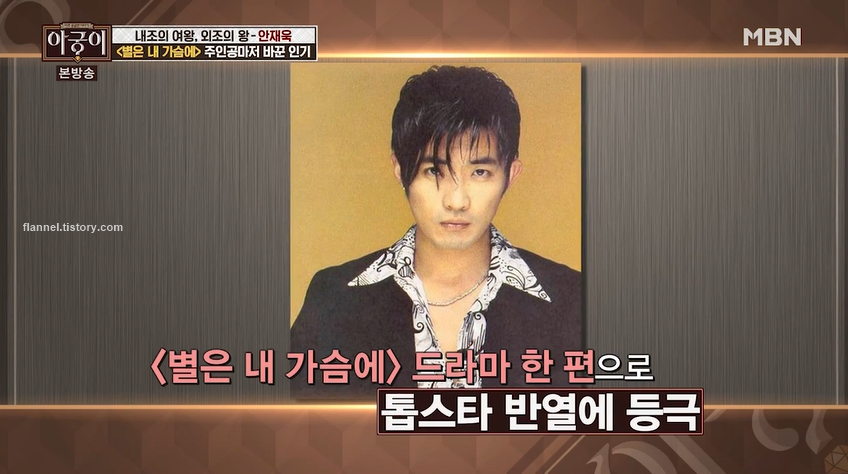 3년 후인 1997년 드라마 '별은 내 가슴에'에 출연하며 인기 스타 반열에 올랐죠. 당시 주인공은 차인표였지만 조연 안재욱이 너무 인기가 많아져 결국 대본을 수정, 여주인공 최진실이 안재욱과 연결되는 결말을 맞았다고 하네요.