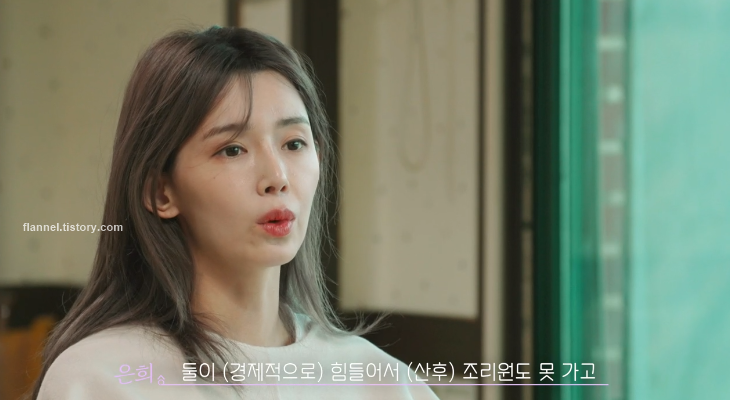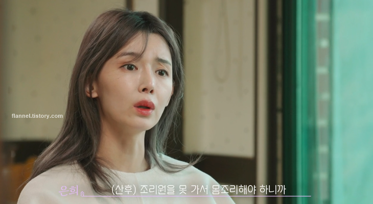 대화하다 은희는 결국 폭발했는데 경제적으로 힘들어서 산후조리원도 못 가고 아기 낳아 끙끙대면 옆에라도 있어줘야 하는 거 아니냐고 따졌어요. 이에 남편 건우는 그때 장모님 댁에서 살지 않았냐며 맞섰지만, 은희는 돈이 없어 조리원에 못 가서 몸조리해야 되니까 엄마집에 있었던 거라고 설명하네요.