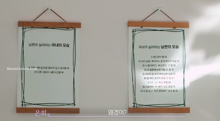 서로 마음에 안 드는 점을 적어 놓은 두 사람. 남편은 싫어하는 아내 모습으로 1. 기분 나쁜 일 바로 말하지 않고 쌓아둘 때 2. 다른 사람과 나를 비교할 때라고 했어요. 반면 아내는 남편의 싫은 모습으로 1. 핸드폰만 볼 때 2. 내가 살림, 육아하는 걸 당연하게 여길 때 3. 나 볼 때마다 '배고프다'라고 할 때 4. 내 질문에 바로 대답 안 할 때 5. 데이트할 때 트레이닝복 입을 때 6. 밥 먹고 설거지 바로 안 할 때 6. '너' '니'라고 부를 때 7. 아들한테 '이 새끼'라고 말할 때 8. 내 말 듣고 '뭐가 문제야?'라고 할 때라고 말했네요.