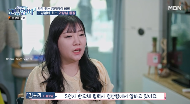 스튜디오에 등장한 김소라. 김소라는 올해 나이 33살이 됐어요. 전남편과는 이혼했다고 하네요. 소라 현재 직업은 삼성전자 반도체 협력사 정산팀에서 과장으로 일하고 있대요. 12살 김하랑과 19살 사랑이 두 딸과 함께 살고 있다고. 친권은 소송을 통해 받아냈다고 하네요.