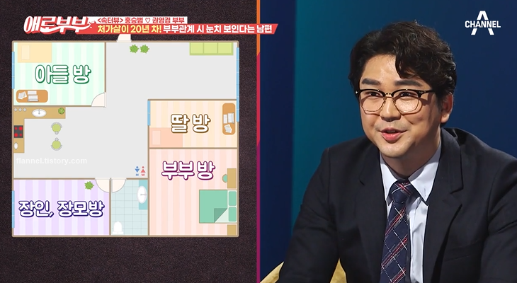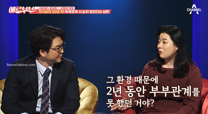 '애로부부' 출연 당시 홍승범은 부부관계 하면서 가장 눈치가 보이는 부분이 처가살이하면서 장인 장모님이 어딘가에 계신다는 거래요. 또한 아들, 딸 방이 없어서 딸 방을 거실을 쪼개서 만들어줬대요. 그러다 보니 두 방의 간격은 약 1m라고 하네요. 환경이 조성되지 않아 부부관계가 힘들어졌대요.