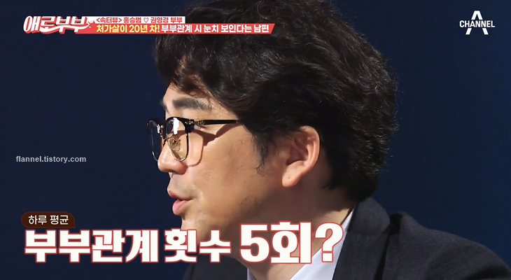 권영경은 부부관계 한 날을 다이어리에 기록하고 만족도를 별로 기록하기도 한대요. 정말 눈만 마주치면 했다고 하네요. 하루 평균 5번, 한 시간 반씩 했다고. 홍승범은 처음엔 훈장 같아 뿌듯했지만, 점점 부담감으로 다가왔대요.
