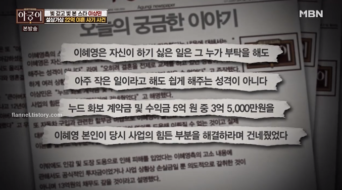 이혜영은 자신의 명의로 10억 원의 차용증명서를 쓰는 바람에 대신 빚쟁이가 됐고, 8천만 원짜리 승용차와 1억 원짜리 승용차를 할부로 구입한 뒤 할부금을 갚지 않았다고 주장했어요. 때문에 채권자들은 이혜영의 통장과 출연료를 압류했다고 하죠. 결국 이혜영은 이상민을 사기로 고소했어요.