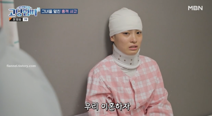 그리고 스튜디오에 등장한 한지이. 사고 당시 뇌출혈이 와서 2주간의 기억이 없다고 하네요. 현재 세 딸과 19살 친동생과 4살 조카까지 함께 살고 있대요. 친오빠가 아이를 키울 수 없는 상황이라 같이 살고 있다고 하네요. 남편과는 교통사고 이후 1년 반 정도 별거하다가 이혼했대요.