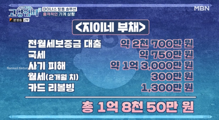 현재 한부모수당 80만원+아동수당 10만원+생계급여 66만 원 해서 수입까지 약 350만 원을 받고 있는 지이. 하지만 약 750만 원이 적자네요. 리볼빙 이자도 높아서 이대로 가다간 파산할 수밖에 없다고.