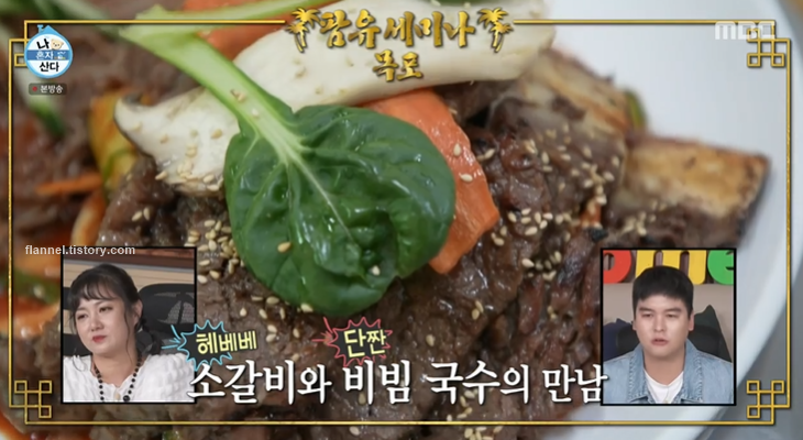 드디어 나온 메뉴. 한 접시에 비빔국수와 소갈비가 함께 담겨 나오네요. 갈비는 미리 화로에서 구워서 나온대요. 비빔국수와 소갈비, 단짠의 조합이 너무 맛있겠어요! 이장우는 목포에서 먹은 것 중에 1등이래요.