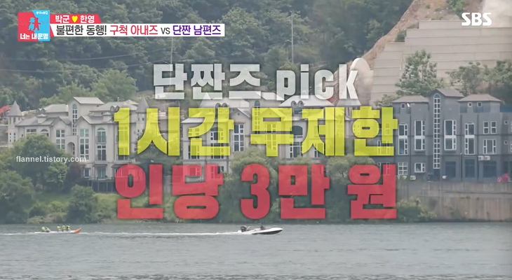 다양한 물놀이를 즐길 수 있는데 보트는 생각보다 가격이 나가네요. 왼쪽 보트는 10분에 10만 원이래요. 하얀색 오른쪽 보트는 5분에 만 원. 절약하려는 박군은 오른쪽 보트를 타자고 하고 한영은 왼쪽 보트를 타자고 하고 ㅋㅋㅋ 둘이 되게 다르더라고요.