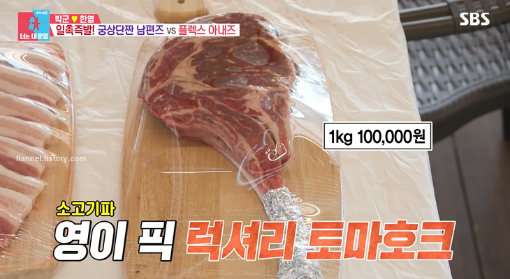 물놀이를 끝내고 야외 바비큐를 먹으러 간 멤버들. 외부 고기 반입은 금지고, 매점에서 판매하는 고기를 구입할 수 있어요. 삼겹살부터 목살, 토마호크, 장어까지 모두 있네요. 토마호크는 1kg에 무려 10만 원, 한돈 돼지고기는 180g에 18000원, 독일산 돼지고기는 180g에 12000원이네요.