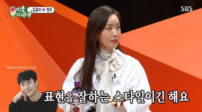 1년 뒤 같은 '미우새' 프로그램에 출연한 김유미. 정우가 애정표현을 잘하는 스타일이라며, 사랑꾼임을 인정했어요. 그러면서 유머감각에 완전 마음을 열었다고 하네요.
