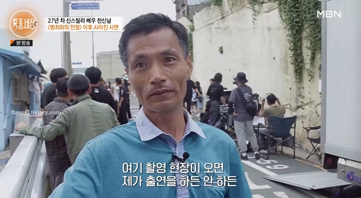 배우 천신남이 '특종세상' 590회에 출연했어요. 천신남은 최민식 주연의 영화 '범죄와의 전쟁'에서 동료 세관원 역으로 출연한 바 있죠. 영화 데뷔 전에는 연극 무대에서 오랜 시간 내공을 다져왔어요. '범죄와의 전쟁' 이후 수많은 러브콜이 쏟아졌지만 모습이 보이지 않아 궁금증을 자아냈죠.