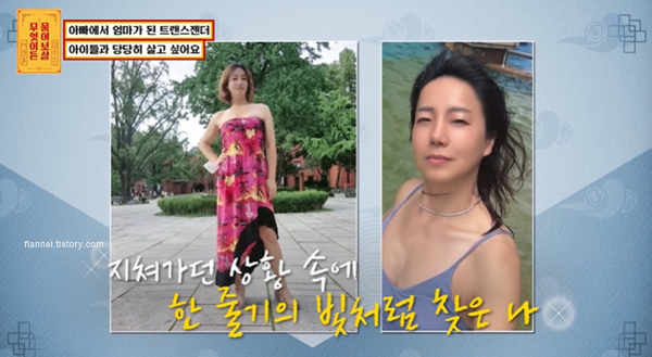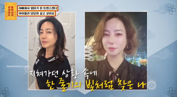 외국인 아내와는 2년 전 이혼했대요. 자녀들은 엄마랑 살고 주말에는 자신이 돌보고 있대요. 가족들에게 커밍아웃은 3년 전 했는데 아내는 그럴 줄 알았다고 했다네요. 아이들은 점점 엄마로 변해가는 걸 보며 호칭을 '큰 언니'로 바꿨대요. '큰 언니는 왜 여자가 되고 싶어?'라고 물어본다고. 그러면 성별 요정이 씨앗을 반대로 줘서 그렇다고 답한대요. 현재 첫째 아들 11살, 둘째 딸은 10살, 셋째 딸은 8살이래요. 아이들이 지금 좋아하는 게 수술까지 마쳤기 때문에 찜질방, 워터파크 등 아빠가 케어할 수 없던 것들까지 다 해줄 수 있기 때문이라네요. 녹색학부모회도 열정적으로 참여한다고.