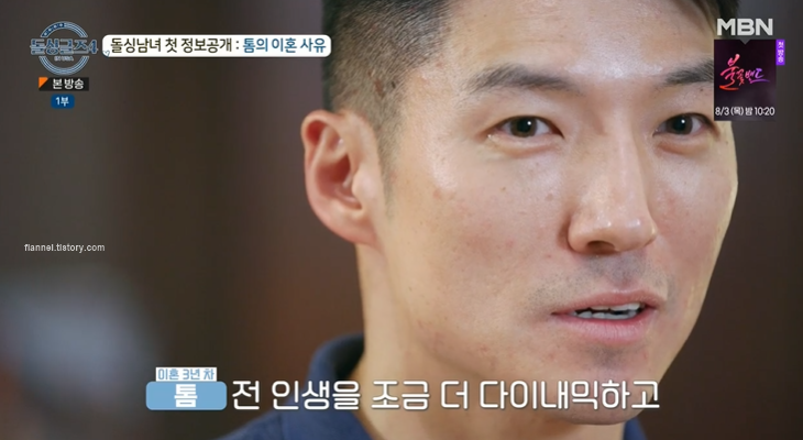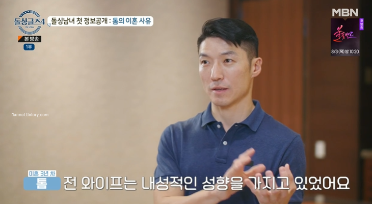 톰 전 부인은 대만 사람이라고 해요. 그런데 한국 드라마 같은 거 많이 봐서 한국말을 좀 했대요. 전 아내가 한국 문화에 관심이 많았고 자연스럽게 만나게 됐다고 하네요. 하지만 톰은 많이 외향적이고 전 와이프는 내성적인 성향을 가지고 있었대요. 톰은 인생을 좀 더 다이내믹하고 활달하게 살고 싶은데, 전 부인은 밖에 나가는 것보다 집에서 톰과 시간을 보내는 걸 더 좋아했죠. 그래서 당시 톰 입장에서는 인생을 너무 재미없게 사는 느낌이었대요.