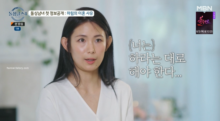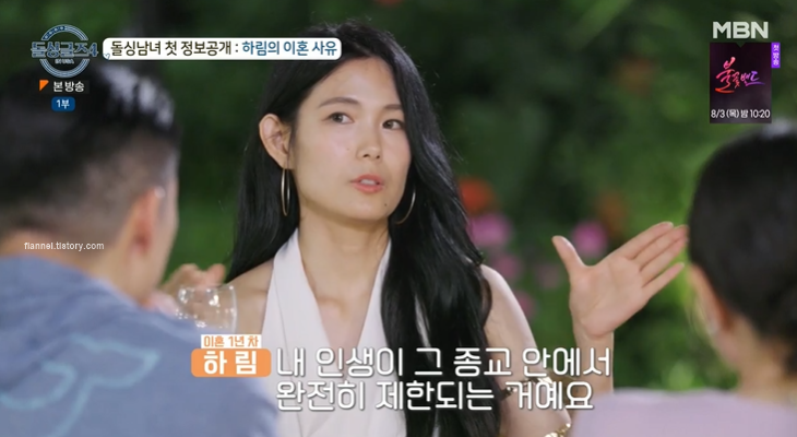 하림은 결혼했지만 그 종교를 안 믿었대요. 그래서 시댁에서는 바랐던 아들의 인생이 며느리 때문에 어긋나니까 며느리 탓을 많이 했대요. 시부모님이 나이도 많고 옛날 한국방식을 가지고 있었다고 하네요. 옛날 한국 문화와 종교가 같이 섞이니까 여자 입장에서는 되게 불공평해졌대요. '너는 며느리니까 하라는 대로 해야 한다' 종교에 대한 트라우마와 여성에 대한 어긋난 시선, 뚫을 수 없는 벽을 가진 사람과의 삶이 이혼 사유였던 것. 계속 결혼 생활을 한다면 자신을 잃고 살 것 같았고, 무엇보다 살기 위해서 이혼했대요.