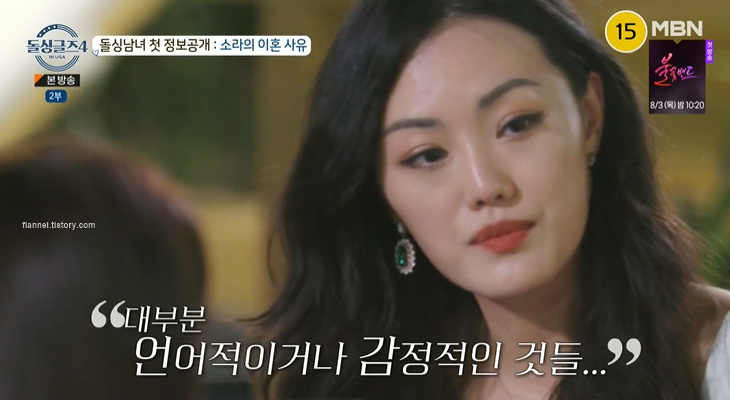 소라 전남편은 이탈리아계 백인, 미국 사람이었대요. 분노 조절을 못해서 엄청 차가웠다 엄청 뜨거워졌다 그랬대요. 별 거 아닌 일에 소리 지르고 하는 사람이 자신에게 그럴 수도 있다는 걸 생각하지 못했대요. 그래서 가정 폭력 소송, 접근 금지가 나왔대요.