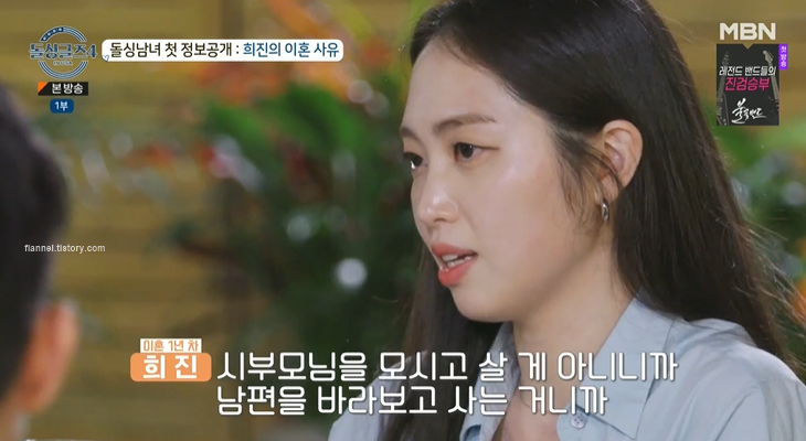 "나는 이혼하게 된 이유가 연애 때부터 사실 고부갈등이 있었어. 그 당시에는 전남편이 중간에서 되게 노력을 많이 해줬고 중재도 많이 해줬고 그런 노력하는 모습에. 시부모님을 모시고 살 게 아니니까, 남편을 바라보고 사는 거니까 이 사람을 믿고 결혼해도 되겠다 싶어서 결혼을 했는데 고부간의 갈등이 점점 더 심해지는 거지"