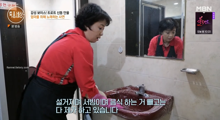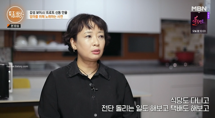 안율 어머니(이선미, 나이 46세)는 안율이 녹화 중에 급히 인천 연안부두에 위치한 한 해물탕집을 찾았어요. 무슨 일인가 싶었는데 식당에서 파트타임으로 일을 하고 있대요. 왕복 3시간이 걸리는데 인천까지 출근하는 이유는 율이 스케줄을 따라다닐 수 있게끔 사장님이 많이 배려해 주기 때문이래요. 일하는 직원이 자신밖에 없어서 서빙부터 설거지, 화장실 청소까지 다 하고 있다고 하네요.