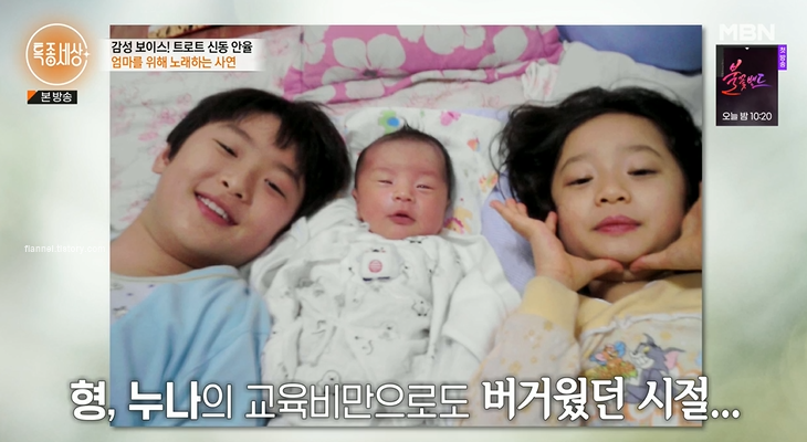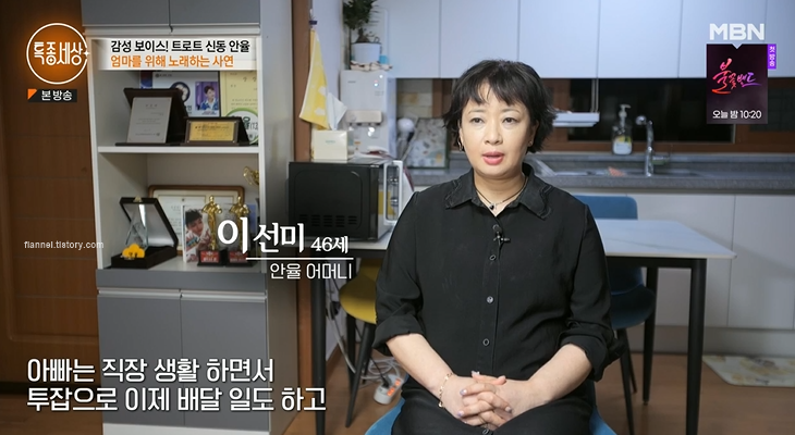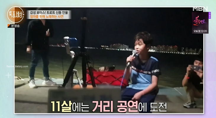 아들의 재능을 처음 알게 된 건 7살 때래요. 노래방에서 노사연의 '바램'을 예약해 놨는데 안율이 마이크를 뺏어서 불렀대요. 워낙 내성적인 아이였는데 노래 부를 때는 눈빛부터 달라졌대요. 이후 11살에는 거리 공연에도 도전했다고 하네요.