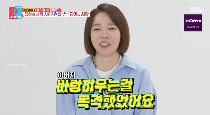 정이랑의 집착은 지금도 진행형인데 아침에 남편이 보이지 않자 20통 넘게 전화를 했더라고요. 그 시각 사우나에 있었던 남편은 어리둥절. 그 이유를 물으니 정이랑은 어릴 때 아버지가 바람피우는 걸 목격한 적이 있대요. 그때 불안의 씨앗이 심어진 거 같다고 하네요. 타고난 것도 있는 거 같다고.